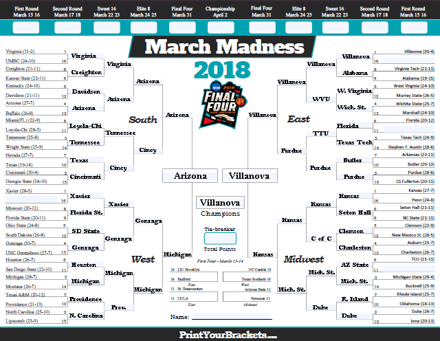 I like Davidson over and South Dakota State over Ohio State in the first round. I think the Jackrabbits are poised for a win if their key players perform as they did in the Summit League Tournament. Beyond that, I think a battle-tested Providence squad will upset North Carolina in the 2nd round, and I really like Arizona over Virginia. The Cavaliers lost a key player going into the tournanament, but regardless, I think Arizona has the overall skill and talent to beat Virginia. Advancing further, I like Gonzaga to knock off Xavier on their way to the elite eight. Their experience from last year's title game run will carry the Zags.
