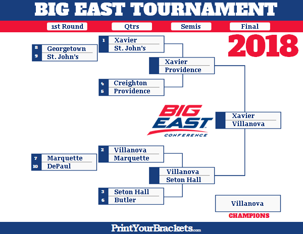 This will be a fun one. I know, I know. You're looking at my bracket and you're thinking I don't know what I'm talking about because it's basically chalk (that's when all the higher seeds win throughout a tournament - for those aren't in the know). So let me be honest - I'm not all that confident with these selections. I played it safe. Lame, I know. The reality is there are a lot of contenders here - at one point of filling this out I actually had Seton Hall winning the whole thing. I think Providence could make a run. Heck, even 10 seed DePaul and 9 seed St. John's have proven they're capable of pulling an upset or two during the regular season. But when trying to find the balance between making a prediction, and being smart, I have to go with Xavier and Villanova because they are the two best squads in the conference. Prove me right 'Nova, please!