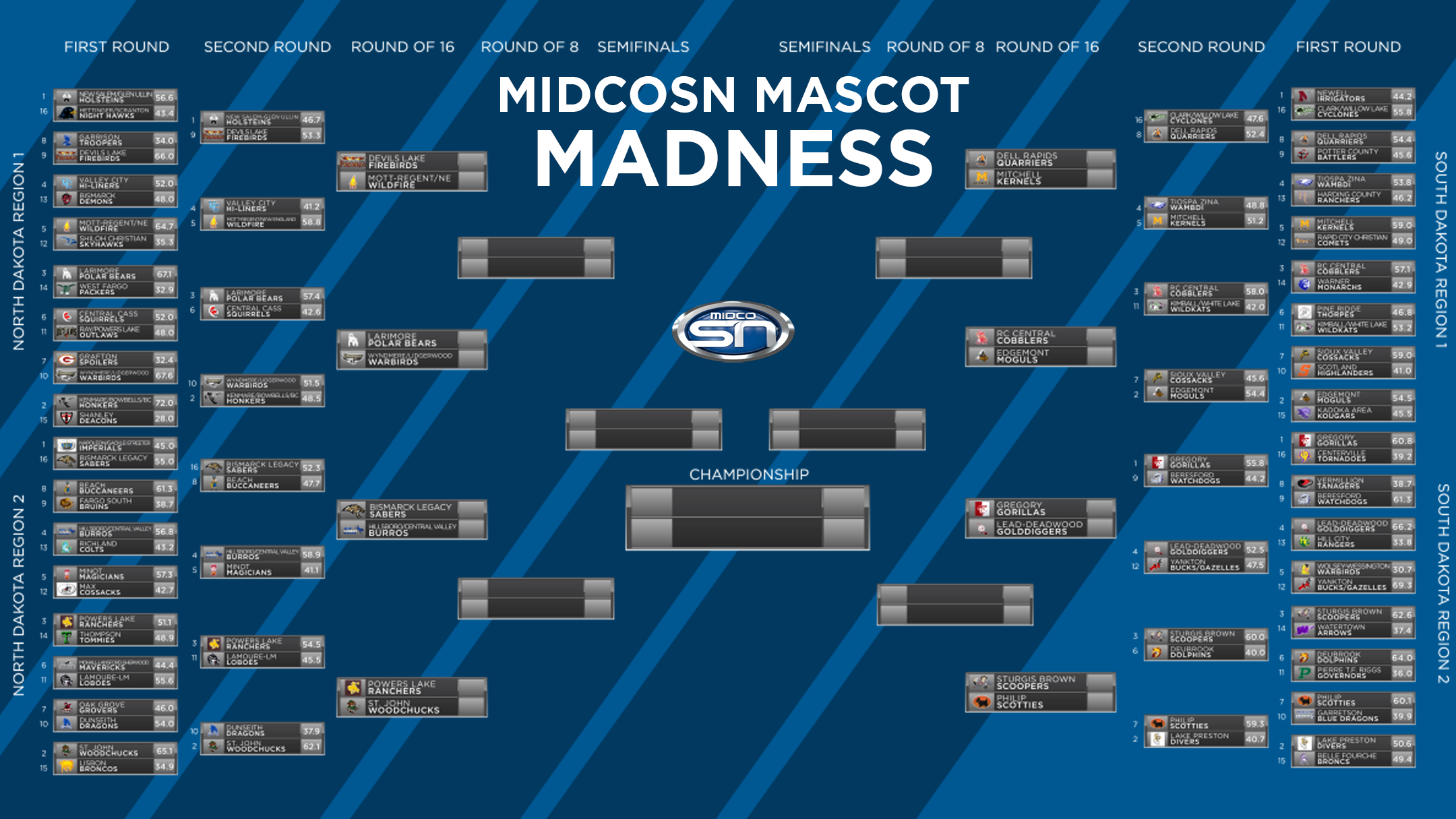 First, we only considered original mascot names in North Dakota and South Dakota. (Sorry, Tigers). Then, from that pool, we chose our top 32 from each state. We took those 32 teams from each state and split them into random regions: two from SD and two regions from ND. Then we seeded teams one to sixteen based solely on our opinions.