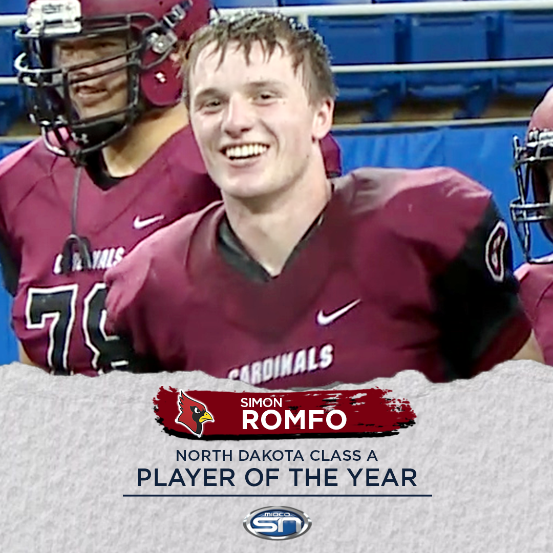 Langdon-E-M senior QB/DB Simon Romfo earns the honor for the third time after leading the Cardinals to a third straight perfect season and state title! Congrats to the MidcoSN ND Class A Player of the Year.