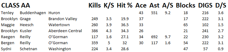 This class features a lot of talent. Brooklyn Kusler of Aberdeen has the most kills and digs on this list. But it’s Bergen Reilly who has the most kills per set. Maggie Heesch of Watertown is an all-around great player with the top hitting percentage and 65 blocks on the year. Tenley Buddenhagen and Raegen Reilly are premier setters in the class. Brooklyn Grage of Brandon Valley is solid across the board and Sydni Schetnan remains the biggest intimidator on one of the state’s top teams. This class will be a very tough decision.