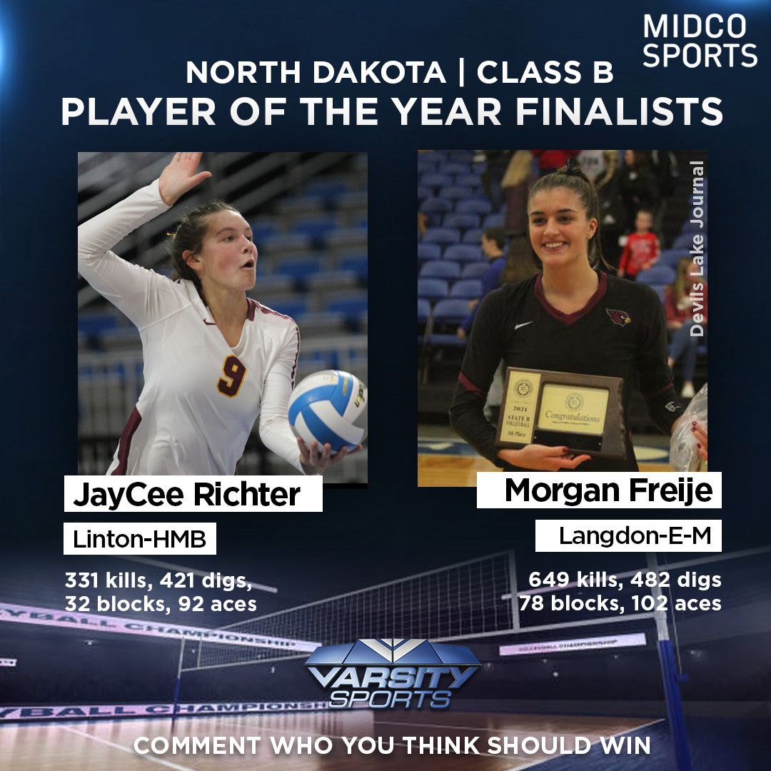 The 2021 high school volleyball season is in the books and congratulations to all the teams, especially the state champions from Bismarck Century and Linton-HMB! This year, we decided to put a bow on the season by recognizing some of the top players in each class sponsored by North Dakota Farmers Union Insurance. We emailed all the coaches across the state to get nominations. We compiled that information and then had the difficult task of narrowing the list down to our two player of the year finalists and honorable mentions for each class. If you don’t see a player that’s worthy of being mentioned, please reach out and submit their name/school and stats. I’ll do my best to add them. Email jody.norstedt@midco.com. We apologize in advance because it’s inevitable that some worthy individuals will get missed for a variety of reasons. Also, some of the stats below won’t be 100% accurate because they were gathered at various times during the postseason. Thank you for taking the time to check out this blog and congrats to every player across North Dakota because we know the season requires a lot of hard work, sacrifice and commitment!