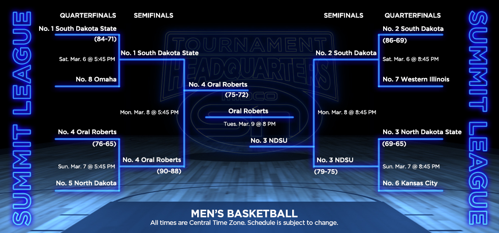 Oral Roberts defeats South Dakota State 90-88 in a Summit League Men's Semifinal. Watch the game recap here and check out the full game replay on Midco Sport Plus. We are your Tournament Headquarters. One champion will emerge. Watch twelve Summit League games live on MidcoSN and Midco Sports Plus.