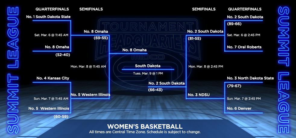 No. 8 Omaha defeats No. 1 South Dakota State 52-40 in a Summit League Women's Quarterfinal. Watch the game recap here and check out the full game replay on Midco Sport Plus. We are your Tournament Headquarters. One champion will emerge. Watch twelve Summit League games live on MidcoSN and Midco Sports Plus.