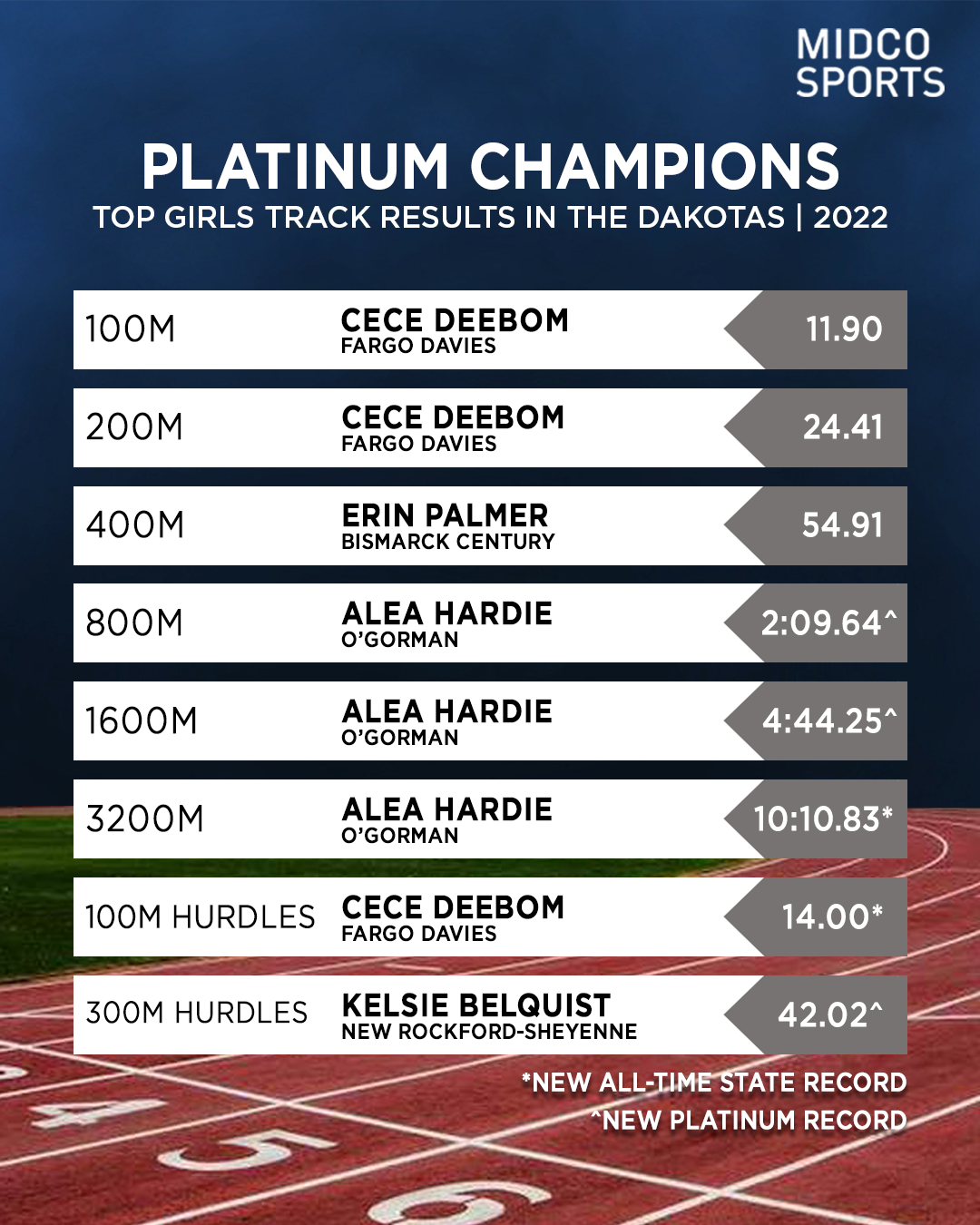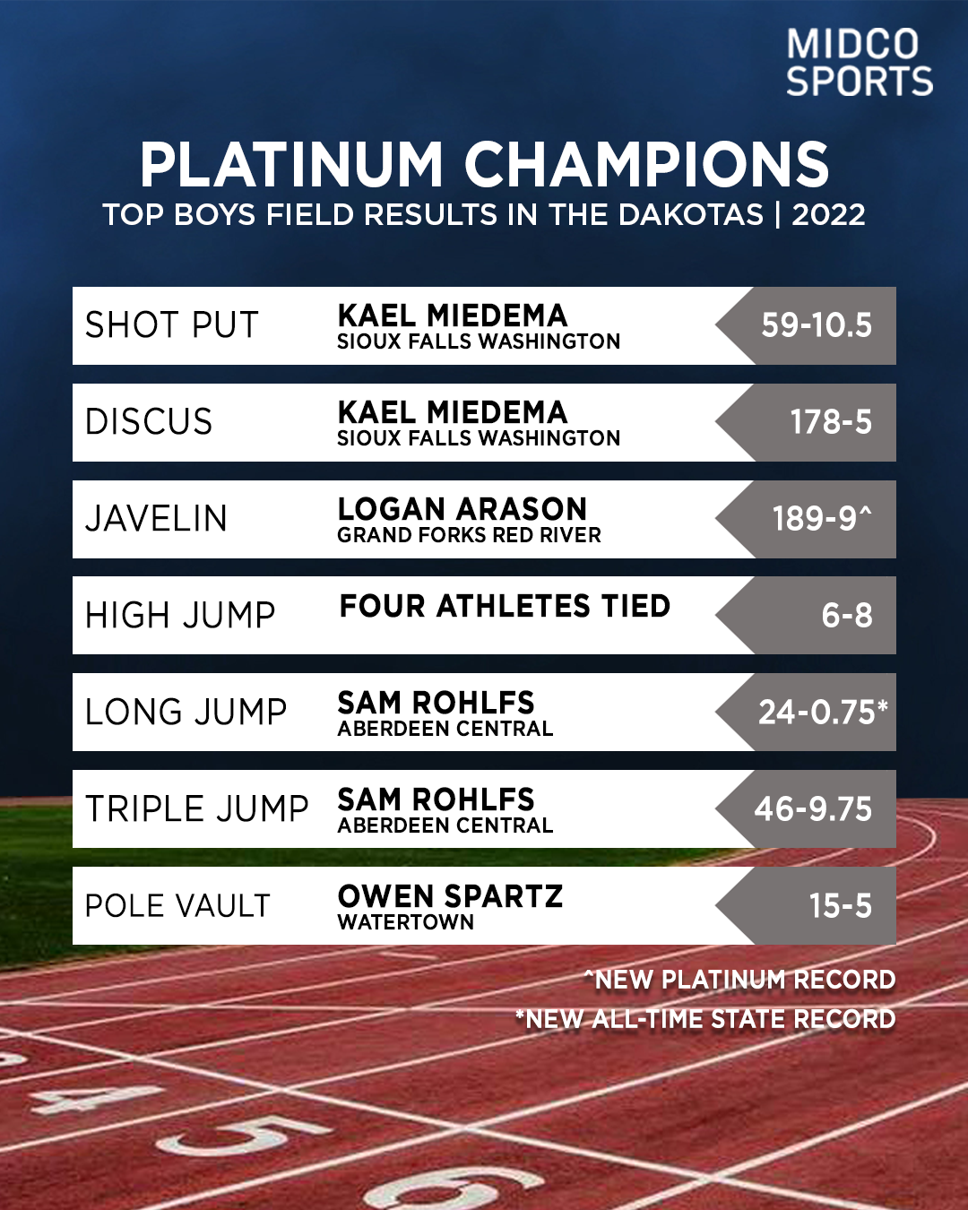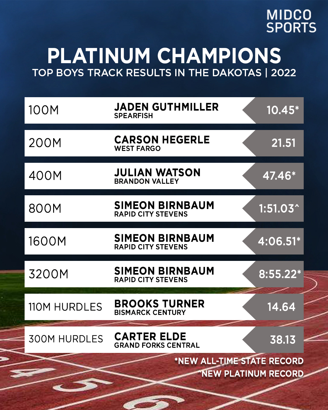 2022 saw Sioux Falls Washington’s Kael Miedema (shot put + discus) and Aberdeen Central’s Sam Rohlfs (long + triple jump) reach double-Platinum status, while two more achieve triple-Platinum in Rapid City Stevens’ Simeon Birnbaum (800m, 1600m, 3200m) and Hardie (800m, 1600m, 3200m), becoming the fifth and sixth athletes to accomplish that rare feat in a single season.