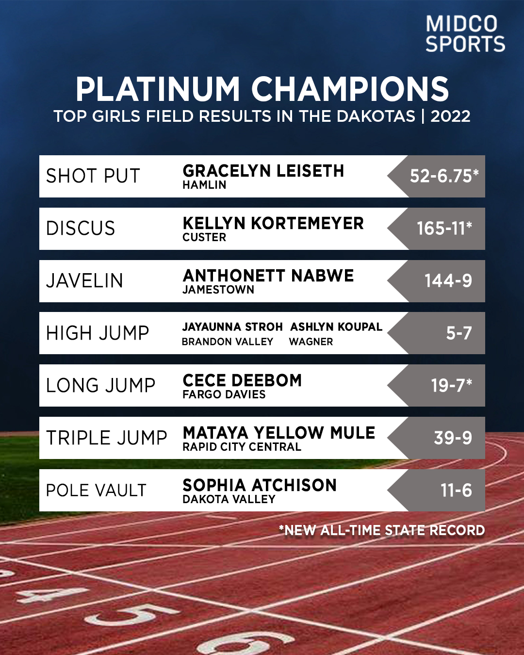 Interestingly, two record-breaking throwers – Custer’s Kellyn Kortemeyer and Hamlin’s Gracelyn Leiseth – earned Platinum status for the second year in a row…only they traded events this time around. Kellyn took the Platinum title in shot put in 2021 and discus in 2022, with Gracelyn doing in the inverse. Not bad for a couple of Class A kids…who also happen to be two of the best in the nation.